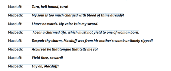Macbeth and MacDuff come face to face, we looked at Shakespeare’s final words and unpicked them, then we re-enacted the last battle.