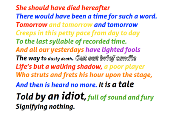 When Macbeth learns that his wife is dead he knows his plans are crumbling at his feet. On hearing the words “The queen, my lord, is dead” Macbeth says: “She should have died hereafter” … We thought about what this may mean. We then performed together using the coloured speech instructions: