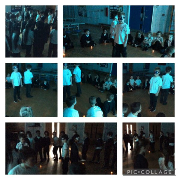 We explored how effective live sound can be in creating dramatic tension, we created our own sound track of natural sounds such as wind, owls, tress and even witches and their families to terrify two blind folded volunteers. We discussed what effect the soundscape had, identifying any particularly effective sounds. We also circled are volunteers and moved in closer to discuss the effectives created.