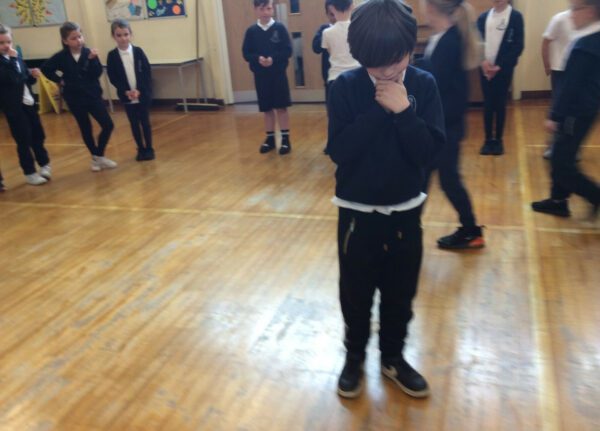 Then we completed story bumps, walking to the beat and command of a drum we crouched down until our number was number (1-4) was called THOSE actors/pupils must stand and become the character(s) are describing, doing the activity you are describing. Everyone else must crouch down low (and watch what is happening), sometimes others were invited to join the ‘story’ as another character.